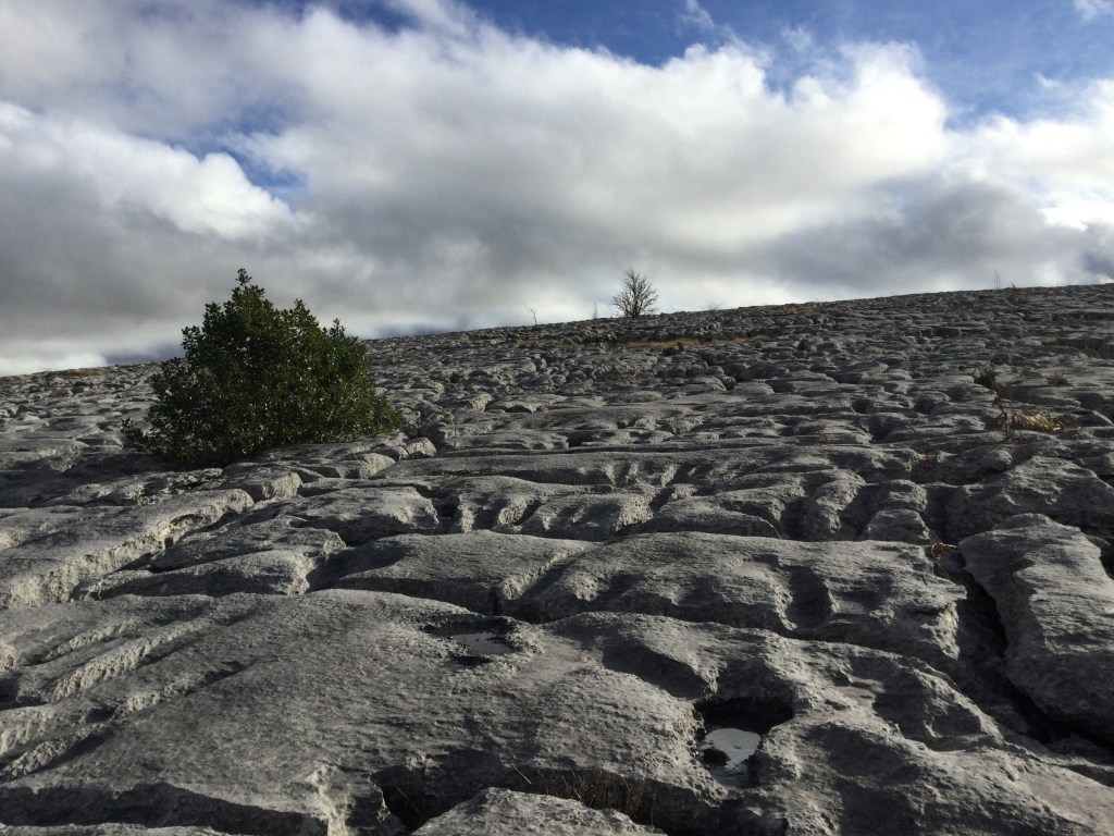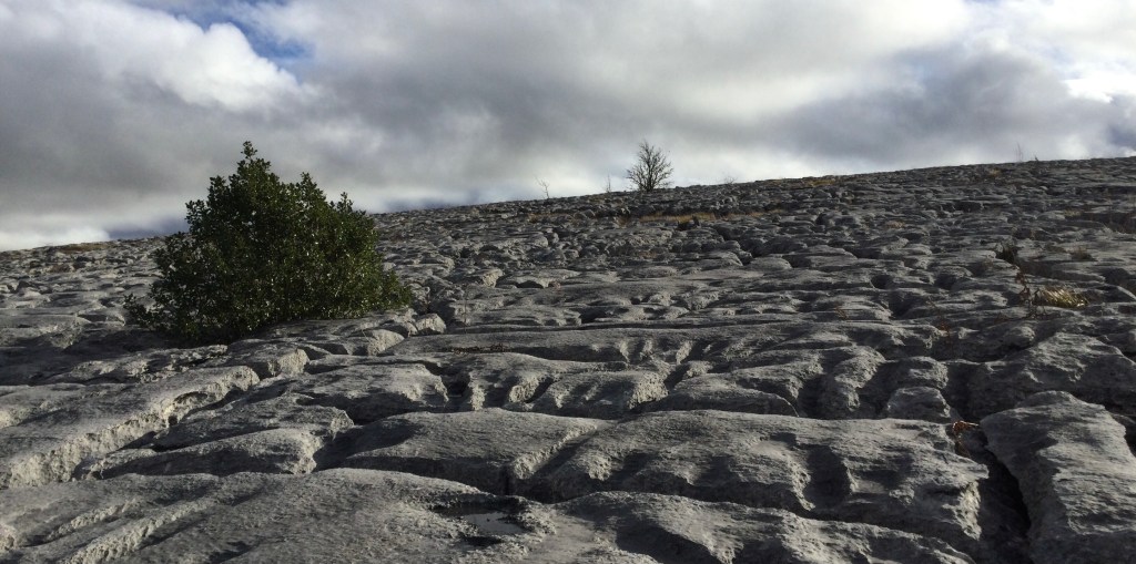 The story does not end there. Next our limestone floor was shifted by the volcanic activity in the area, unimaginable forces lifting it up, breaking it into sections divided by vertical cracks. Then followed the ice age. Immense glaciers, grinding rivers of frozen water, scraped away everything from the surface of the limestone, scouring the rock as it passed above so that when the ice melted, erosion by rain over thousands of years could shape the limestone in a unique way. Limestone is a hard rock, but it is made of calcium carbonate. Water falling as rain has carbon dioxide dissolved within it; it is a very dilute carbonic acid. Acid will dissolve calcium carbonate and this is what happened to our limestone. The rain weathered the scoured limestone, falling onto its surface and running down through the cracks, slowly dissolving away the surface.